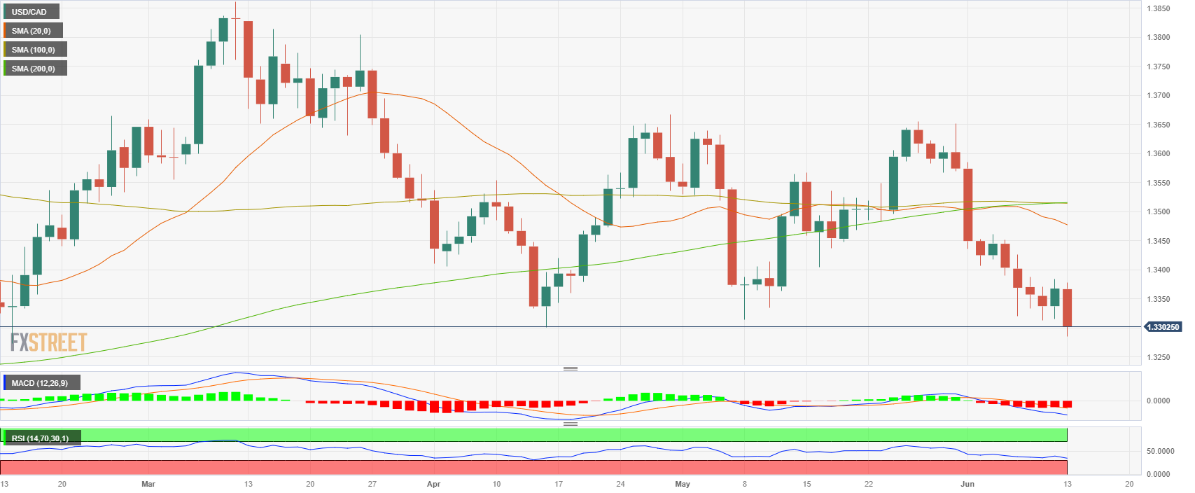 美国CPI公布后,美元/加元跌至1.3300下方的四个月低点