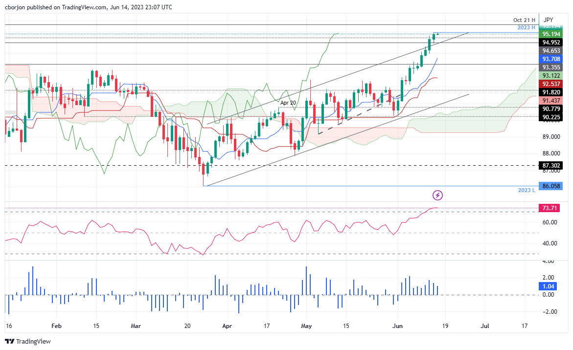 澳元/日元延续上升趋势,但上涨步伐稳定,澳元/日元仍然在一目均衡云图上方,但振盪指标如相对强弱指标可能处于超𧹒区域。因此,澳元/日元交易于95.18,周三达到的年初至今(YTD)高点95.28紧下方。