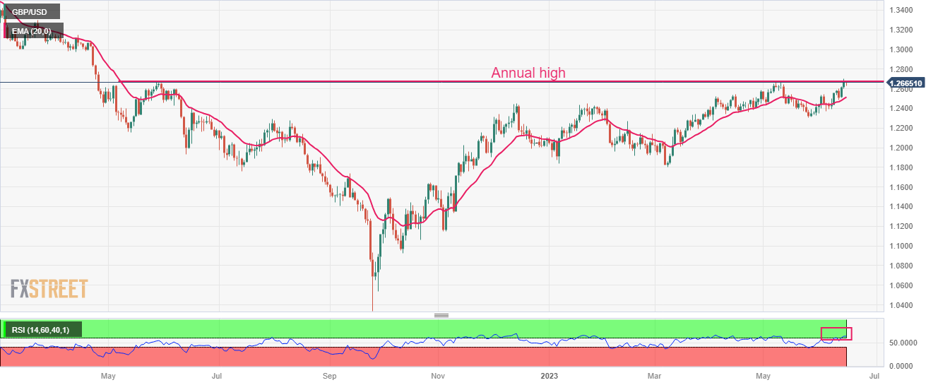 对于进一步上涨,升破1.2700的整数水平阻力位将推动该资产指向2022年4月26日高点1.2773和关键阻力位1.2800。
