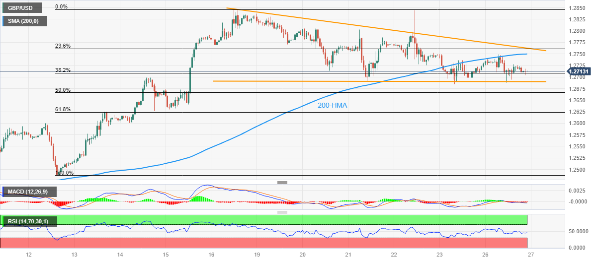 侭管如此,看涨三角形形态吸引多头。然而,多次未能突破200小时移动均缐(HMA),加上MACD信号看跌且相对强度指标(14)持稳,使空头寻求跌破所述三角形的支撑缐,发稿时该水平在1.2690附近。