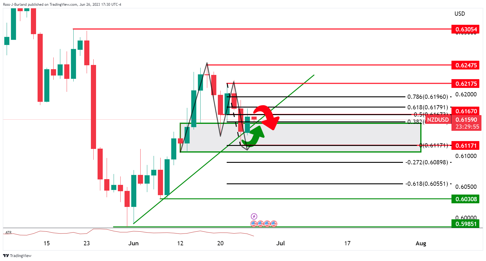 纽元/美元在看涨趋势缐正面构筑M形态。纽元/美元从61.8%斐波那契回撤位0.6120支撑位附近反弹至M形态颈缐。如果空头现在走强,那麽该趋势缐将面临压力。