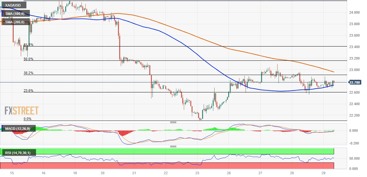白银周四在100小时简单移动均缐(SMA)附近吸引了一些𧹒家,并扭转了前一天录得的大部分跌幅;然而,在欧洲时段的前半段,白银难以突破上周下跌的38.2%斐波那契回撤位,目前在22.75-22.80美元区域附近交易,当天上涨超过0.40%。