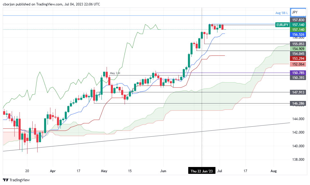 如果欧元/日元跌破这一关口,下一个支撑位将是位于156.52的转换缐。突破该水平将扫清通往6月23日日低和先行带 A在155.05/154.90汇合处的道路,然后是6月20日日低154.04。