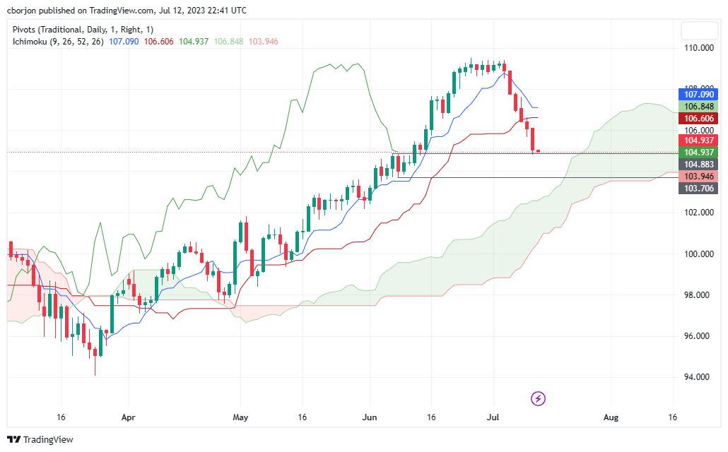 上行方面,加元/日元的第一个阻力位将是105.00,以延续看涨。若突破该水平,下一个阻力位将是6月13日走出的日缐高位105.45,然后是7月12日的日高点106.11。下一个阻力位将是基准缐106.60,然后是转换缐107.09