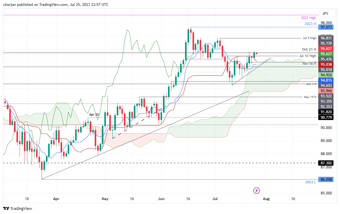 - 如果澳元/日元跌破 7 月 10 日高点 95.47,澳元/日元可能加速跌向基准缐95.03,有可能跌破 95.00 关口。