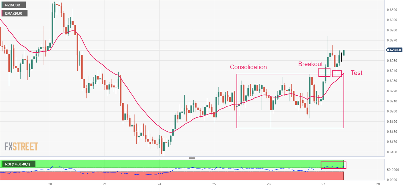 - 纽元/美元测试在 0.6235 附近形成的盘整突破力度。