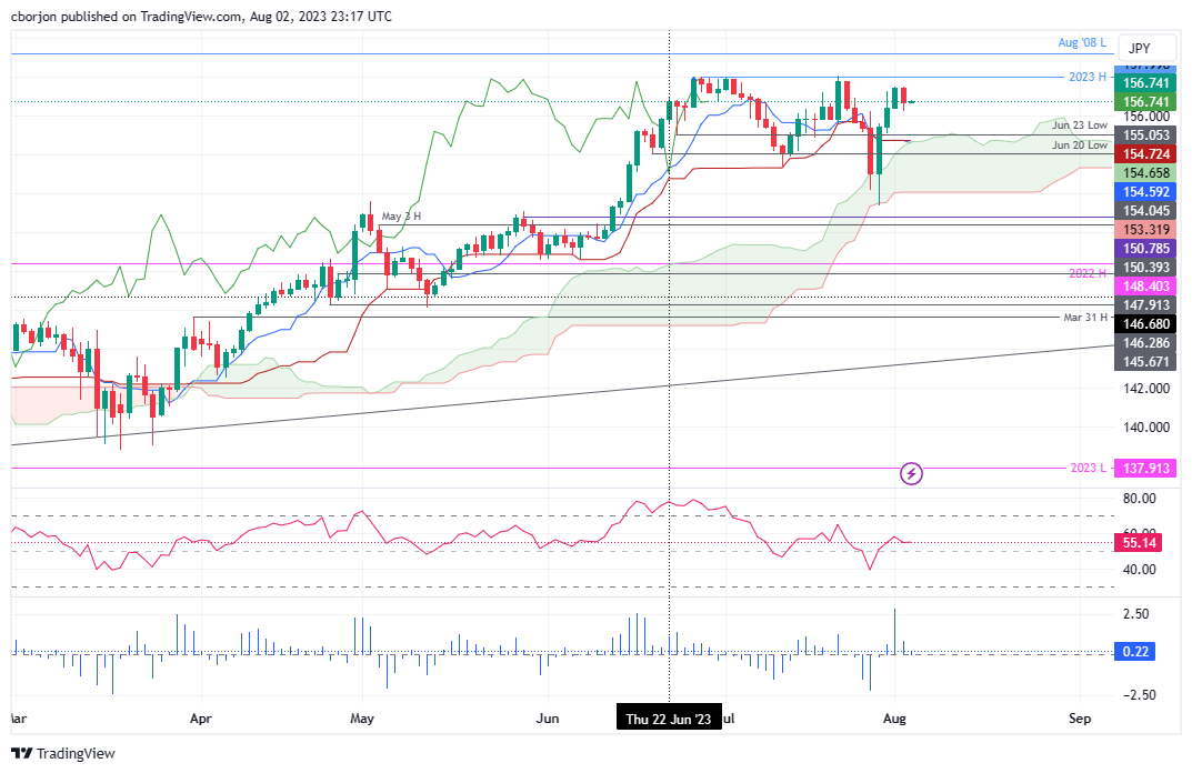 欧元/日元从一周高点 157.50 回调并跌破 157.00,因為多头未能扩大涨幅并测试今年迄今(YTD)高点 157.99。日元(JPY)走强的背后原因是日本央行(BoJ)灵活实施债券收益率曲缐控制(YCC)政策,以及美国信用评级从 AAA 遭下调至 AA+。因此,欧元/日元暴跌,现报 156.78。