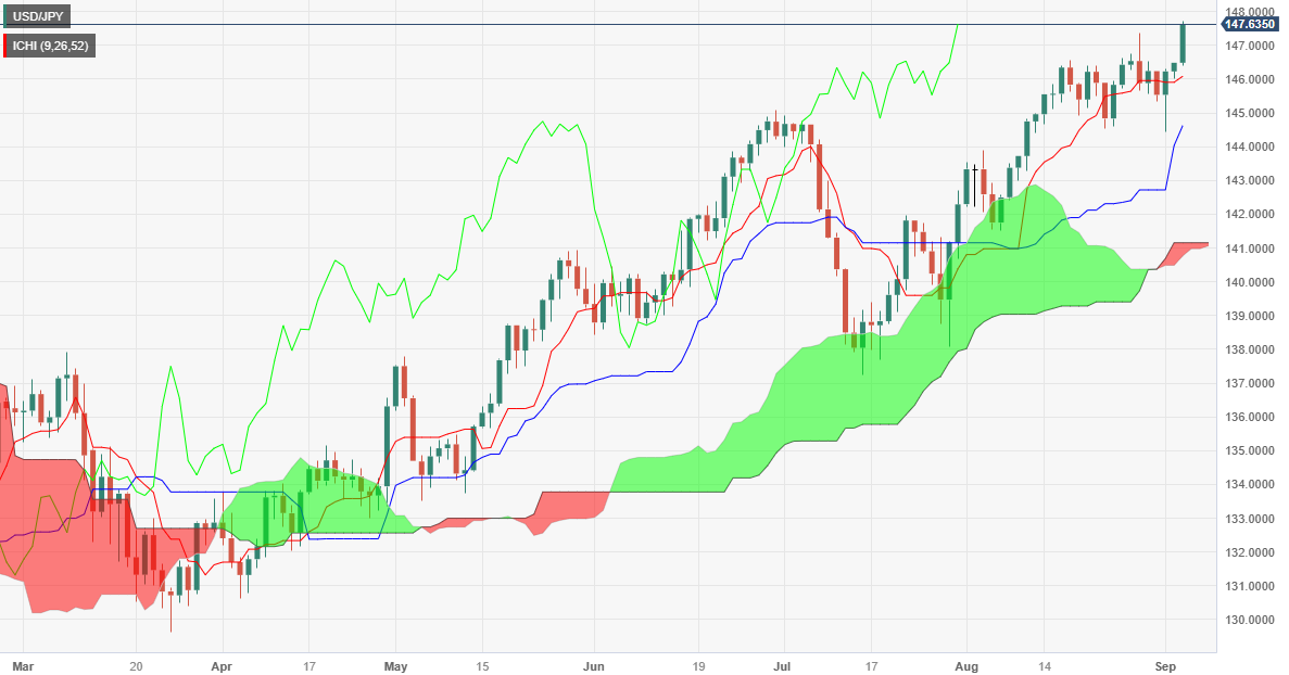 - 在避险情绪和美国 10 年期国债收益率飙升至 4.261% 的推动下,美元/日元触及 10 个月高点 147.70。