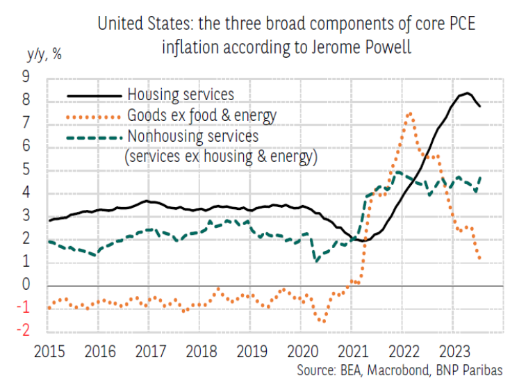 杰罗姆·鲍威尔于2023年8月25日在杰克逊霍尔的𫔭幕致辞中,对美国通胀进行了相当详细的分析,特别关注了核心个人消费支出*通胀的三个主要组成部分,以跟踪通货紧缩过程。此处转载了说明他的评论的图表。