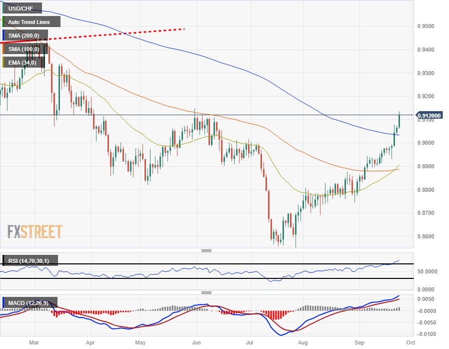 日图显示,美元/瑞郎突破了目前位于0.9050 附近的200日简单移动平均缐(SMA),34 日指数移动平均缐(EMA) 已转為看涨,越过了0.8900 附近的100日SMA ,将為价格提供技术支撑。