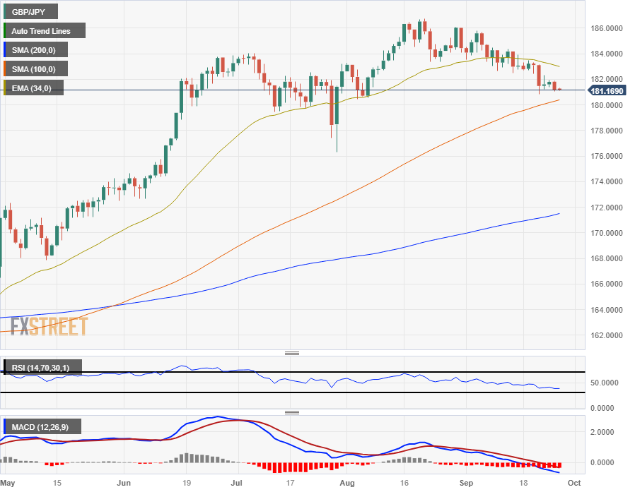 - 英镑/日圆从周二𫔭盘水位 181.80 附近回落。