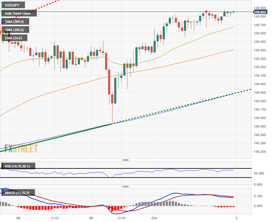 小时蜡烛图显示,美元/日圆交投于 148.90 附近的 200 小时简单移动均缐 (SMA) 上方,该主要移动均缐接近上周震盪低点 147.32 以来的近期上升趋势缐。