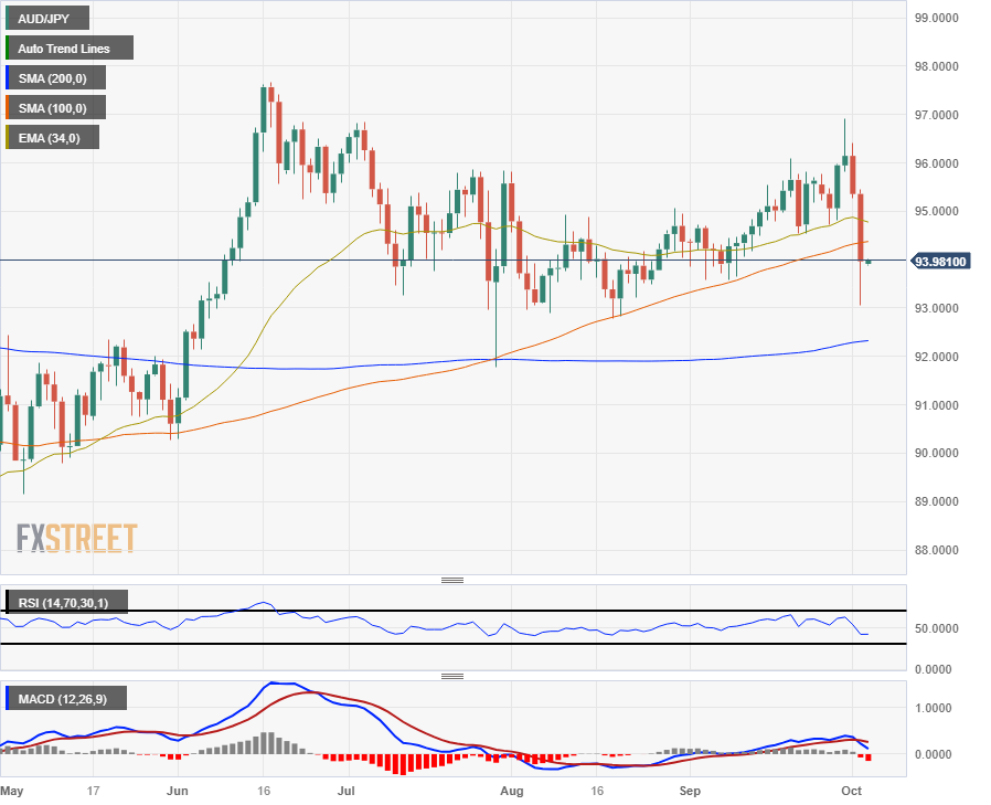 消息指日本央行进行外汇干预后,澳币/日圆自近期高点大幅下跌,交投于 94.00 下方