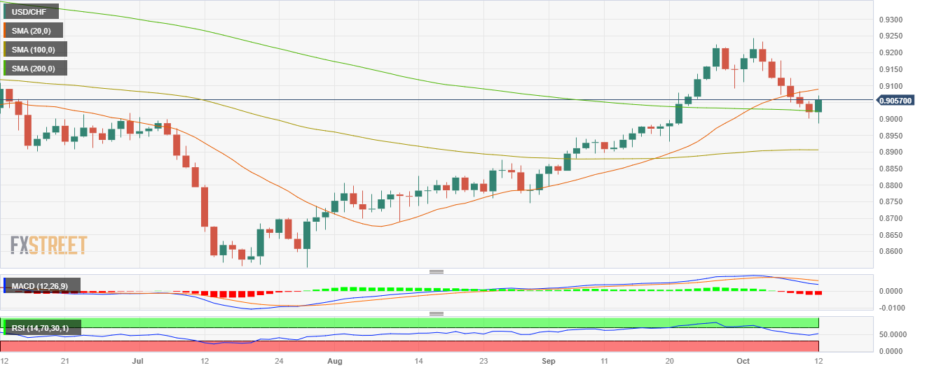 - 美元/瑞郎升至 0.9070 附近的高位,涨幅超过 0.40%。