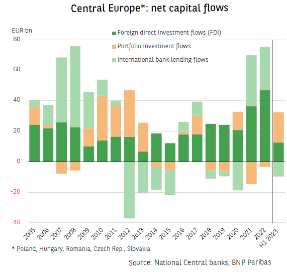 在中欧,侭管地缘政治存在不确定性,但资本流动(外国直接投资、证券流动和银行贷款流动)表现良好。同样,它们似乎暂时没有受到该区域经济活动减弱的影响。在2023年上半年,这一数字达到229亿欧元,超过了疫情前全年的纪录。投资组合流动占了最大的份额,很可能是由于政府公债与德国之间非常有利的殖利率差异。