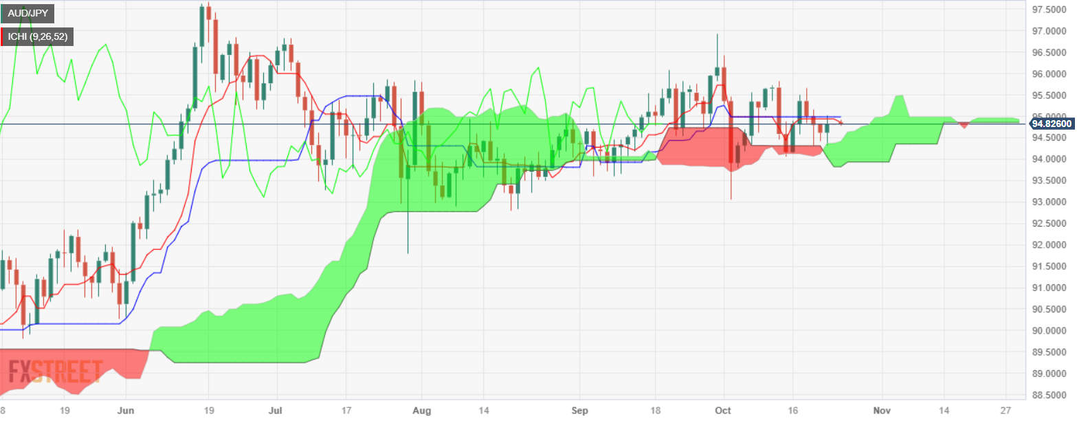 另一方面,如果澳元/日圆挣扎在 95.00 附近,则将测试周一走出的日内低点 94.32,一旦跌破该水平,澳元/日元将跌入一目均衡表云(Kumo)内部。下一个停损点将是一目均衡图云图底部 93.80/84,一旦跌破该水平,澳元/日圆将转為中性下行。