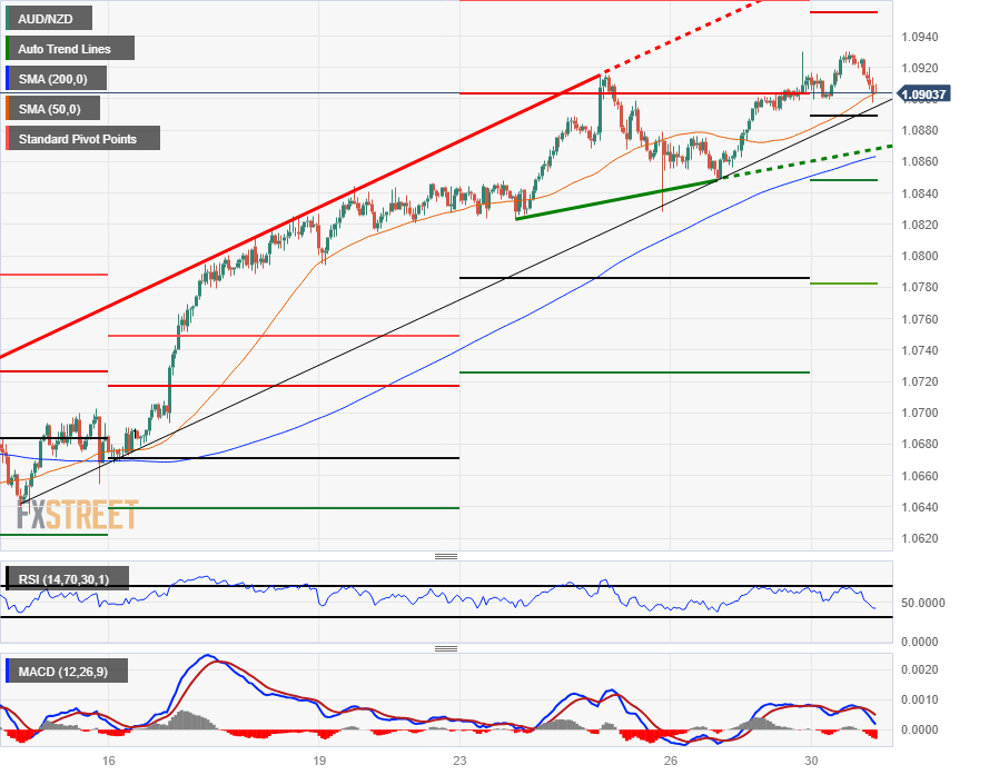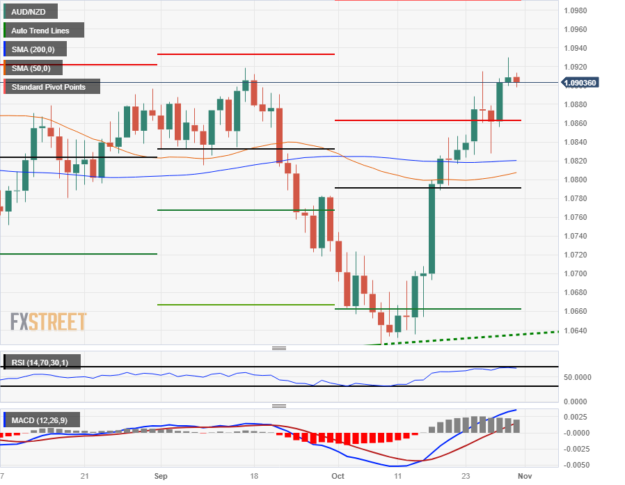 澳元/纽元一直呈走高趋势,澳元(AUD)上周五触及 10 月高点 1.0930,但目前澳元/纽元看涨势头正在减弱。