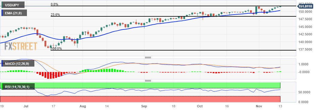 美元/日圆持续上涨,于周一欧洲时段交投于年度高点151.70附近。该货币对可能升向重要阻力位152.00的心理水准。由于美债殖利率上升和联准会主席鲍威尔的鹰派评论,若美元积聚动能,汇价可能升至该位。