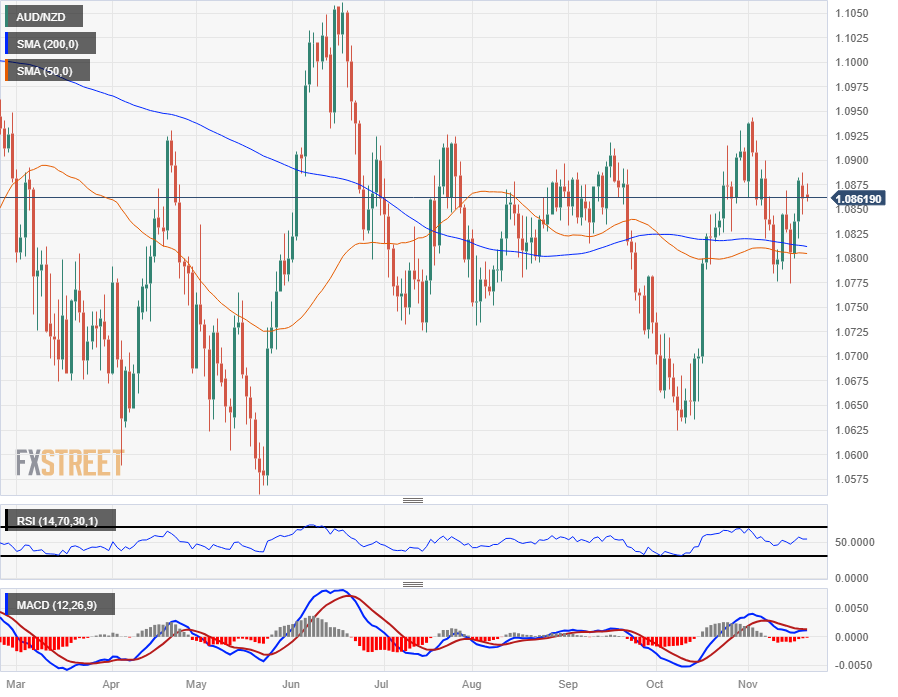 在 2023 年的大部分时间裡,澳元/纽元横盘整理,长期技术指标不断接近中间值,50 天和 200 天简单移动均缐一直盘整在 1.0800 附近。