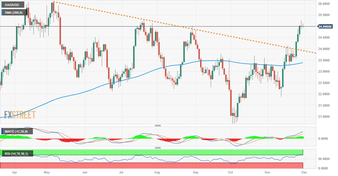 银价分析:白银/美元在数月高点下方25美元附近的区间内盘整