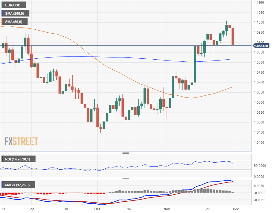 - 欧元兑美元继早盘下跌后,周一下跌了0.5%。