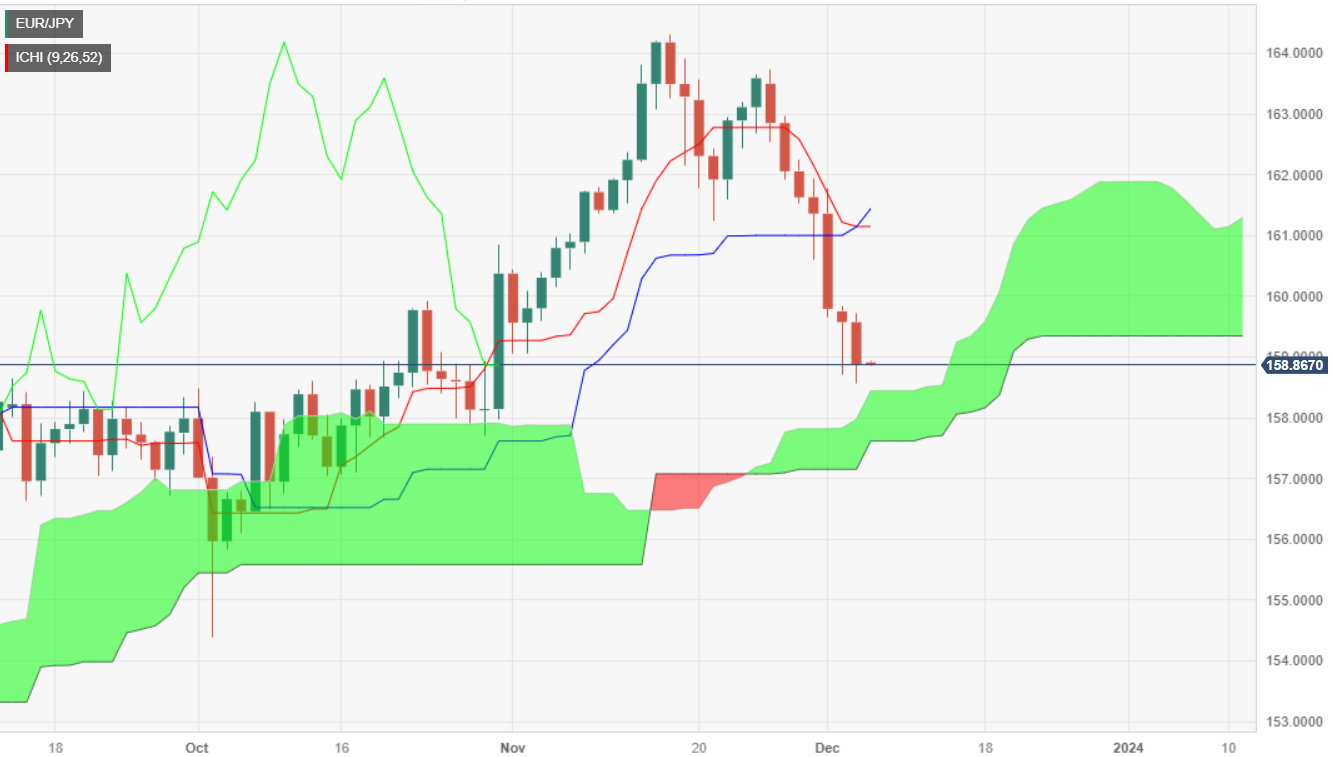 欧元/日圆连续第七天扩大跌幅,徘徊在一目均衡图云图顶部大概在 158.89 上方,继触及日缐高位 159.71 后下跌 0.36%。这一走势背后的主要驱动因素是市场情绪恶化,市场对日圆避险地位的偏好升温,日圆兑多数八国集团(G8)货币(美元除外)升值。