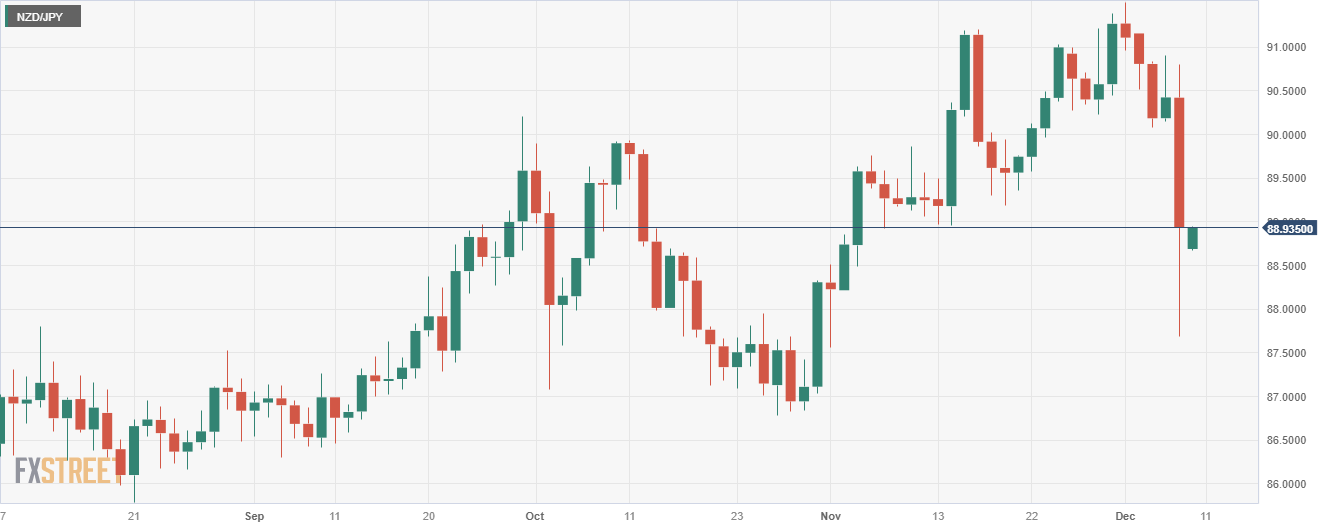 - 纽元/日圆下跌了 1.60%,继跌至 87.70 之后盘整在 88.90 附近。