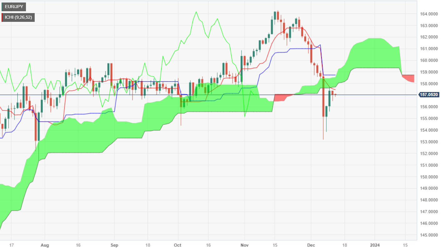 日缐图显示,由于欧元/日圆跌破了一目均衡云图,且转换缐向下穿越基准缐,欧元/日圆走势偏向下行。一旦跌破,下一个支撑位将是 12 月 8 日低点 153.86,然后在12 月 7 日震盪低点 153.11 之前。