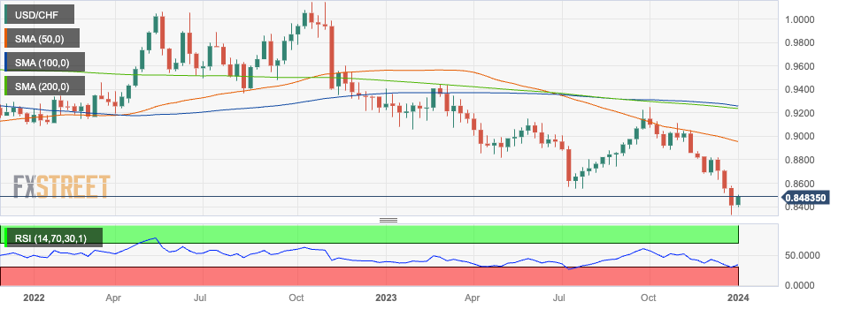 周二,新年伊始,瑞郎(CHF)兑美元(USD)走软。主要原因似乎是美国公债殖利率走高,截至发稿时,5年期、10年期和30年期公债殖利率均上涨了2%以上。殖利率上升似乎表明,债券持有者并不认同普遍持有的观点,即利率可能会像一些人预期的那样在 2024 年大幅下降。利率上升意味著美元走强,吸引更多外国资本流入。