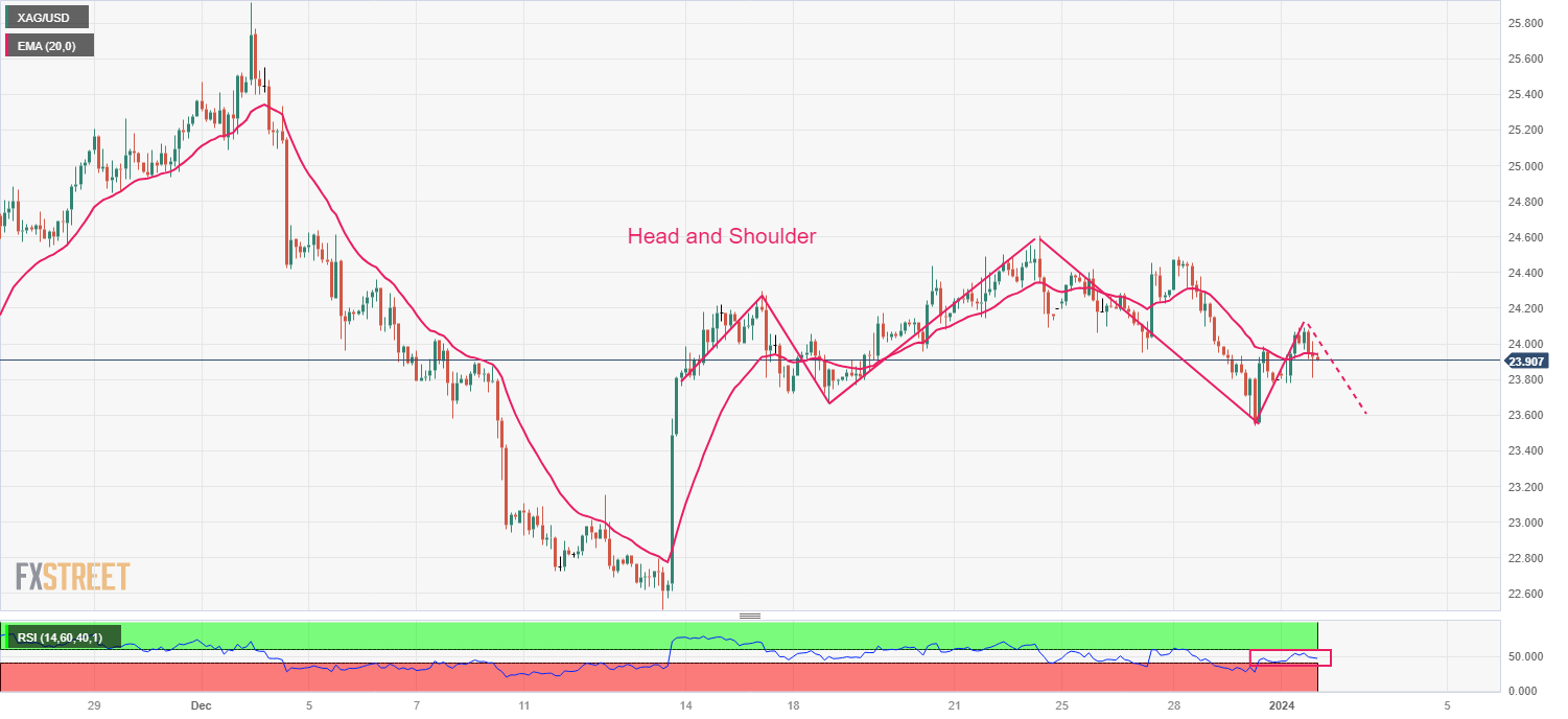 白银价格在两小时图上形成头肩顶形态,表示盘整时间延长。在跌破关键支撑位 23.60 美元后,该图表形态将被触发。该资产难以维持在 20 期指数移动平均缐(EMA)上方,该均缐在 24.00 美元附近交投。