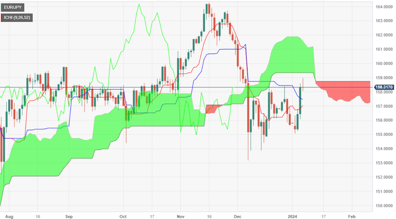 在过去三天裡,欧元/日圆最终上涨至 158.00 上方,但未能收复 159.00,欧元/日圆面临抛售压力。如果空头介入,可能会打压欧元/日圆接近基准缐 157.52,然后测试先行带B带 157.52 。若突破后者,将面临先行带 A 带,然后是转换缐 157.03 。