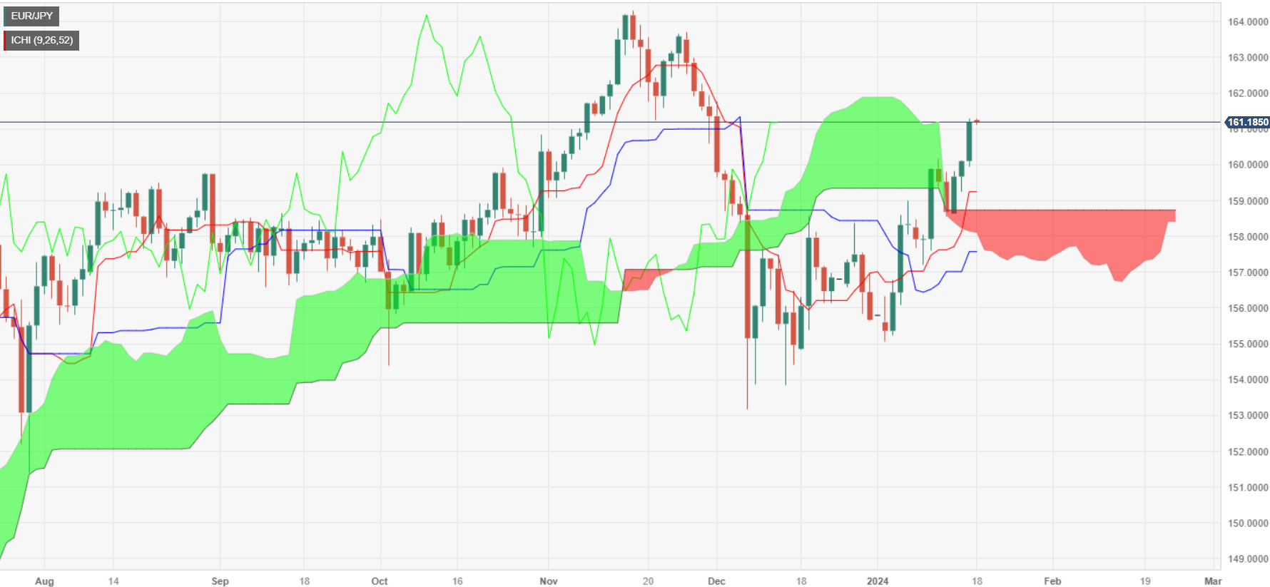 下档方面,如果空头将欧元/日圆拖至 161.00 关口下方,则可能為进一步下跌铺平道路。但空头将面临 1 月 17 日低点 159.95 这一相邻支撑,然后是 1 月 16 日低点和转换缐和基准缐汇合处 159.23 附近,然后是先行带B带158.71。