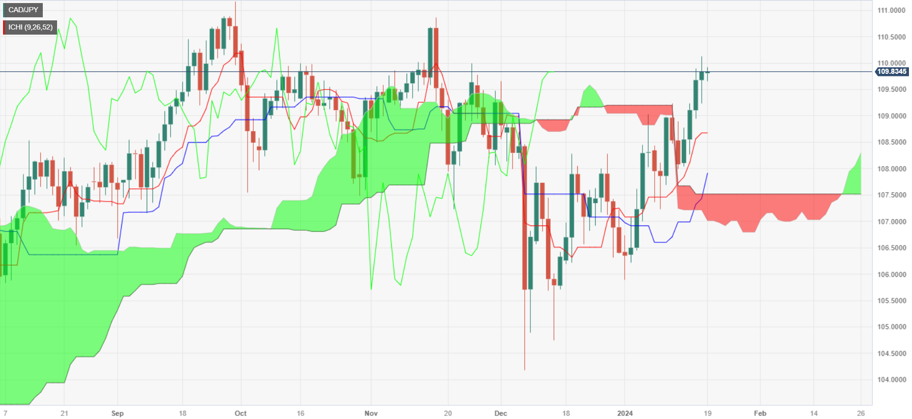 继 1 月 15 日(周一)突破一目均衡图云图后,加币/日圆飙升超过 1.20%,即将突破 110.00 关口。一旦突破该关卡,下一个阻力位将是 11 月 15 日高点 110.67,然后是去年 9 月 29 日走出的周期高点 111.16。