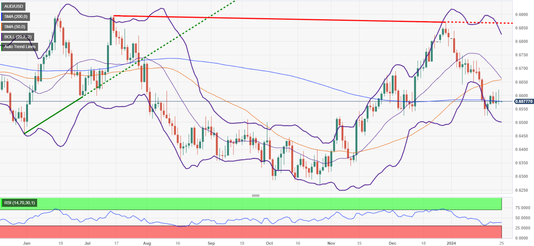 随著周四亚市𫔭盘,澳元兑美元录得微弱跌幅;周三,由于美国经济数据向好,澳元/美元收盘时几乎波动不大,收于0.6600下方。澳币兑美元报0.6576,正在测试200日移动均缐(DMA)。
