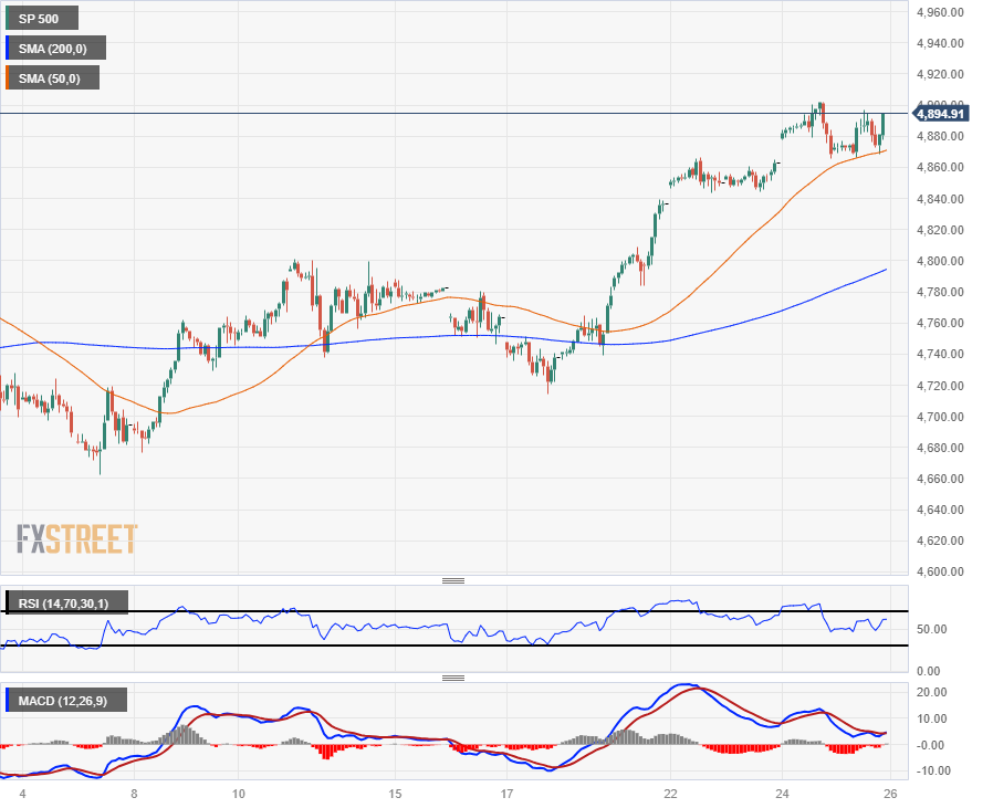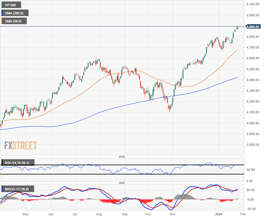 标准普尔(S&P)500 主要股票指数连续第五个交易日收于历史新高,上涨 25.61 点,收于 4,894.16 点,标普500指数继续向 5,000.00 点关键关口挺进。