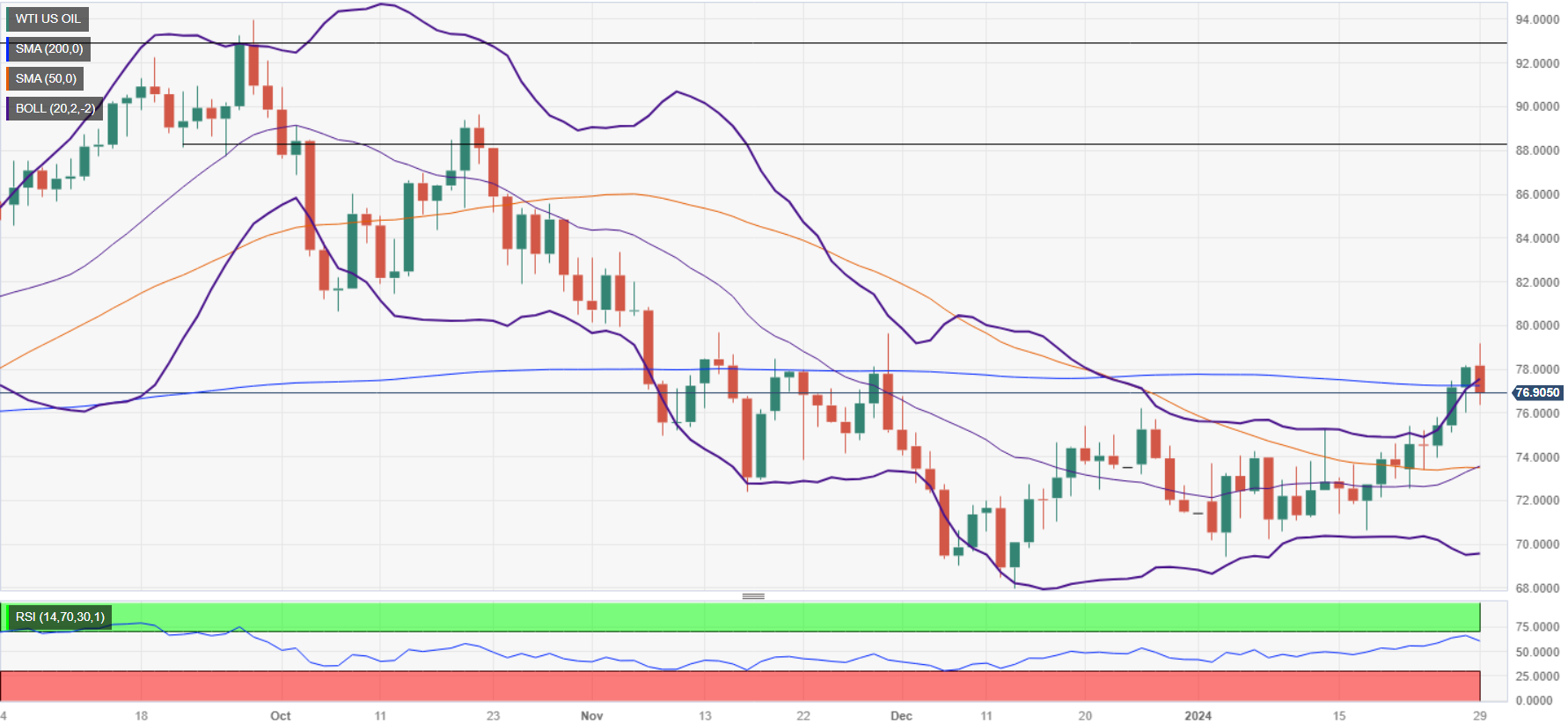 西德州中质原油(WTI)周一大幅下跌超过 1.50%,此前未能突破关键技术阻力位。侭管中东地区的紧张局势不断加剧,但交易商仍观望联准会决议,将维持美元强势。截至发稿时,WTI原油价格為76.90美元。