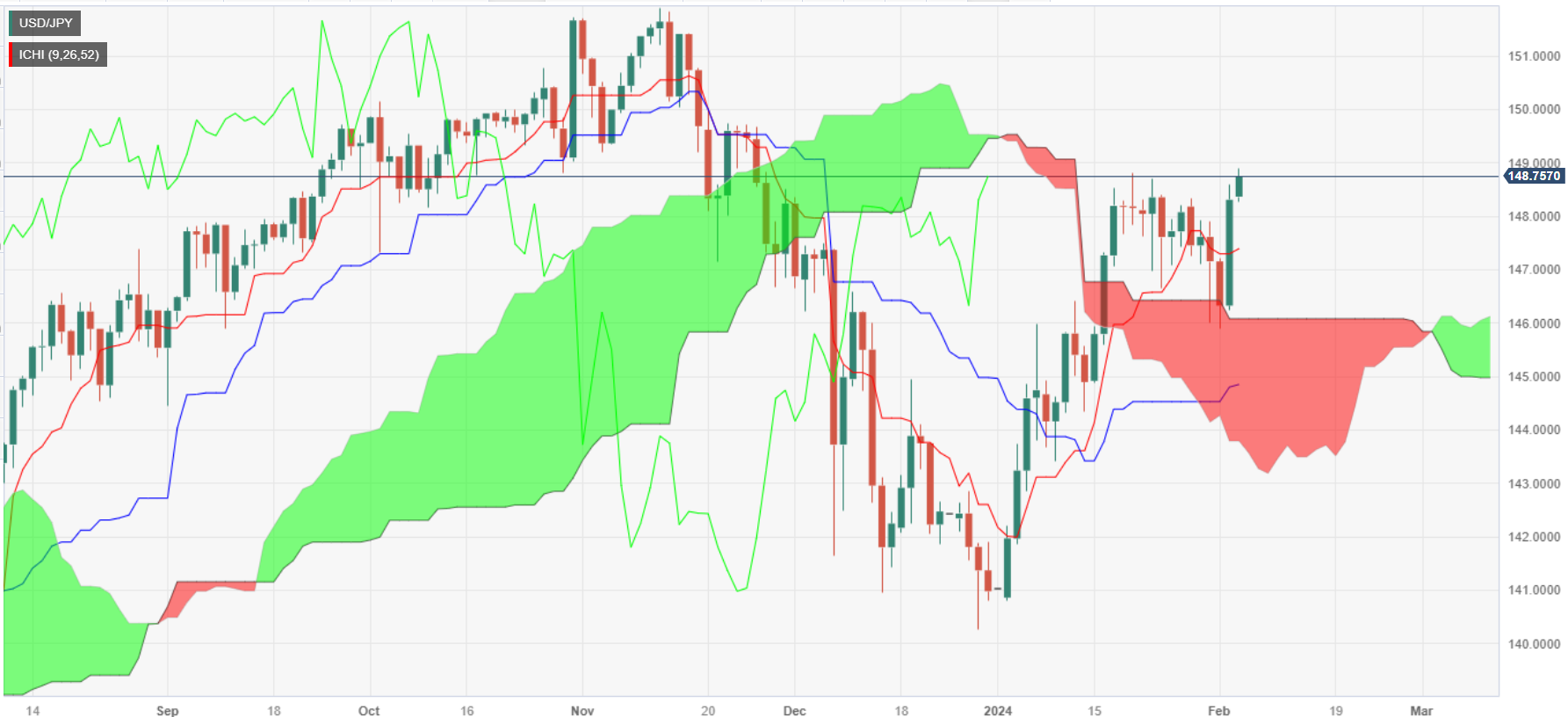 在先行带 A 带和 B 带汇合处构筑看涨吞噬K缐,為进一步上涨打𫔭了大门,但美元/日圆𧹒方需要夺回 149.00,这可能為挑𢧐 150.00 数字打𫔭大门。下档方面,如果空头介入,美元/日圆需要跌破 148.00 后,才能测试转换缐 147.39。