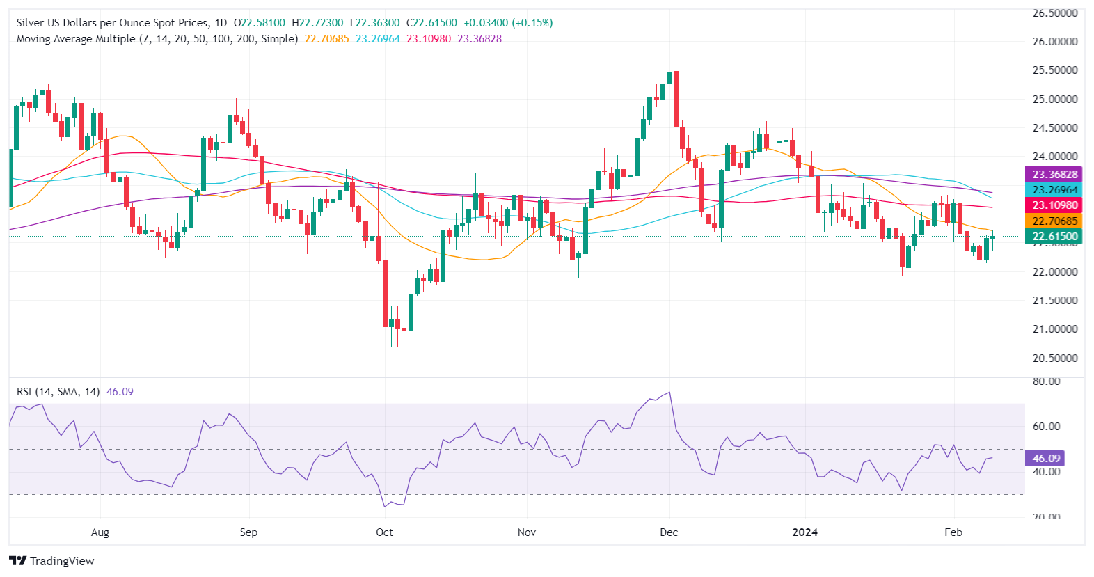 - 有迹象表明银价将在 22.15 美元至 22.50 美元之间触底反弹,暗示有可能接近 23.00 美元。