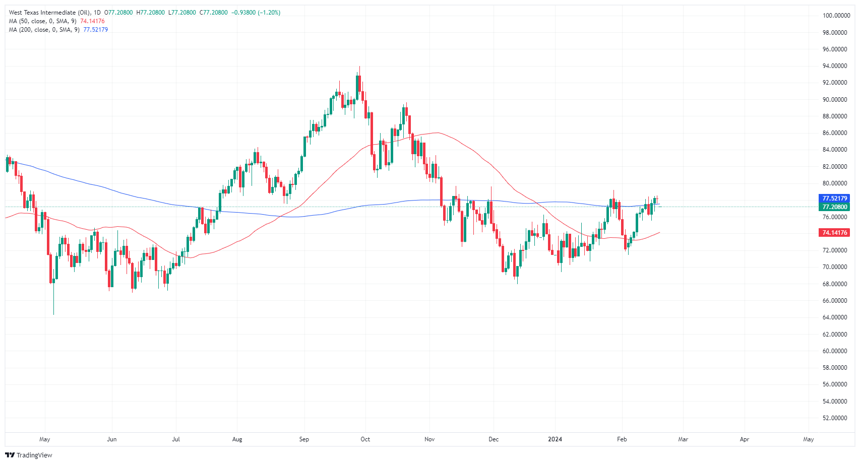 侭管WTI油价从近期低点 68.00 美元附近止跌回升,但仍自 2023 年 10 月高点 94.00 美元附近下跌了近 18%。