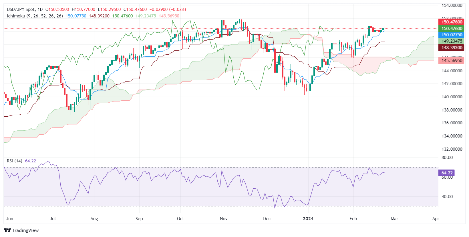 从技术角度来看,美元/日圆维持性偏上走势,仍位于一目均衡图云图上方。价格走势表明,多头需要将美元/日圆推升至2月13日高点150.88上方,才有希望继续看涨。下一个阻力位在 151.00,然后是去年高点 151.91。相对强弱指标仍看涨,显示多头可能占上风。