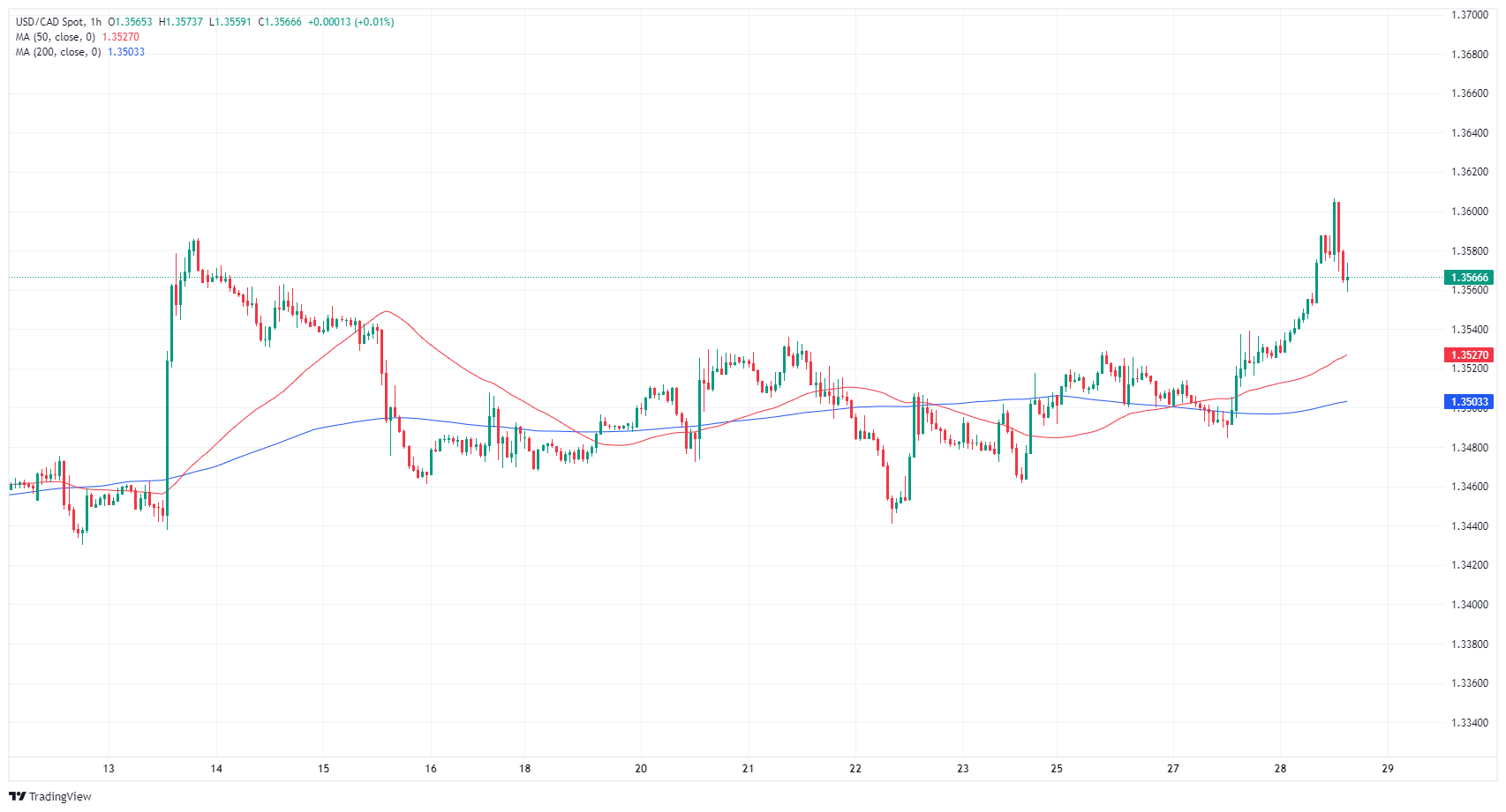 美元/加币在 1.3600 上方触及十周高点,但被美国 GDP 所阻