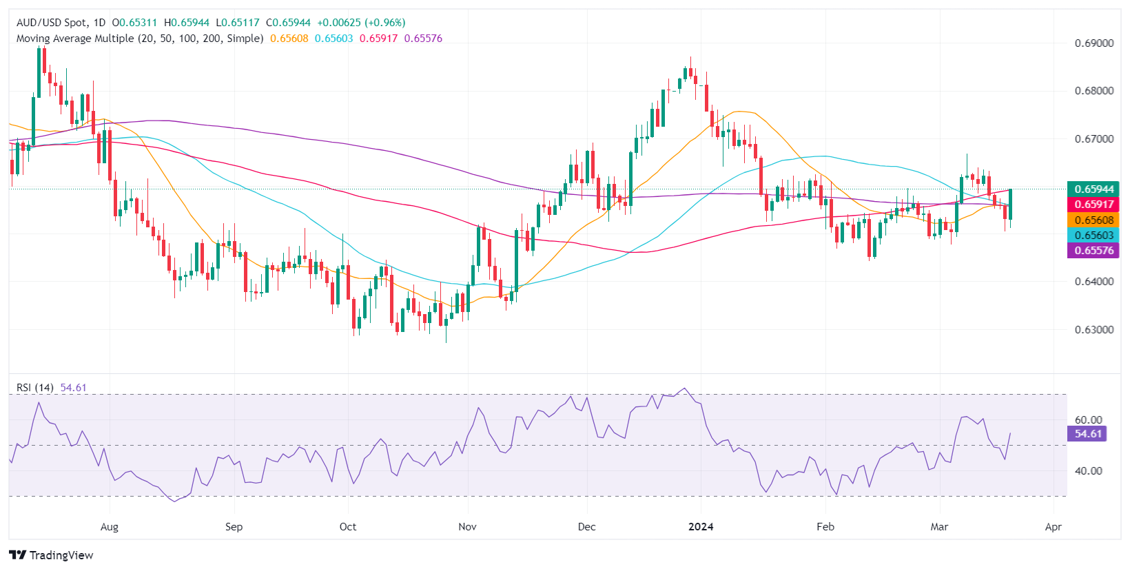 周三,澳元/美元飙升 0.83%,原因是联准会维持 利率稳定,同时维持去年的货币政策展望,即在 2024 年降息 75 个基点(bps)。亚市𫔭盘后,澳元兑美元报 0.6595,上涨 0.14%。