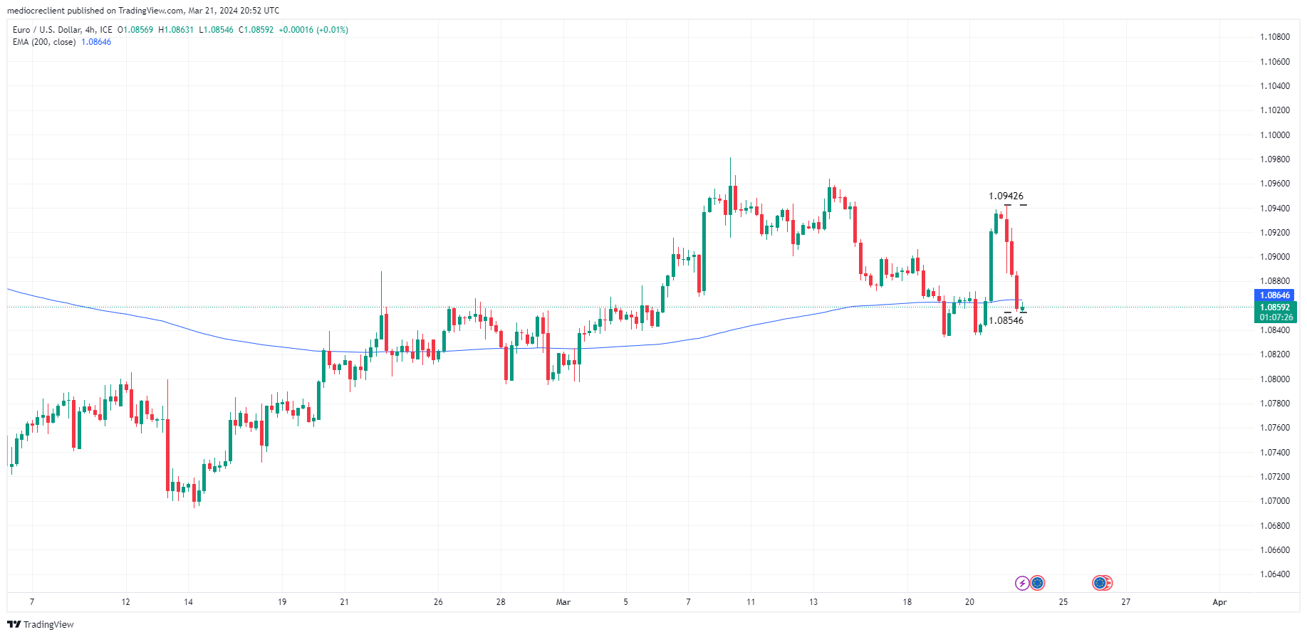 欧元兑美元遇阻处在 1.0864 附近的 200 期指数移动均缐 (EMA) ,周四4小时图显示欧元/美元看跌反转,有可能创下更低的高点。