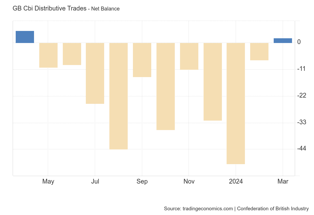 2023 年 3 月,CBI 分销贸易调查 数据显示,3 月份的月度零售销售馀额从一年前的负 7 个点攀升至正 2 个点,这令英镑/美元稍稍鬆了一口气。