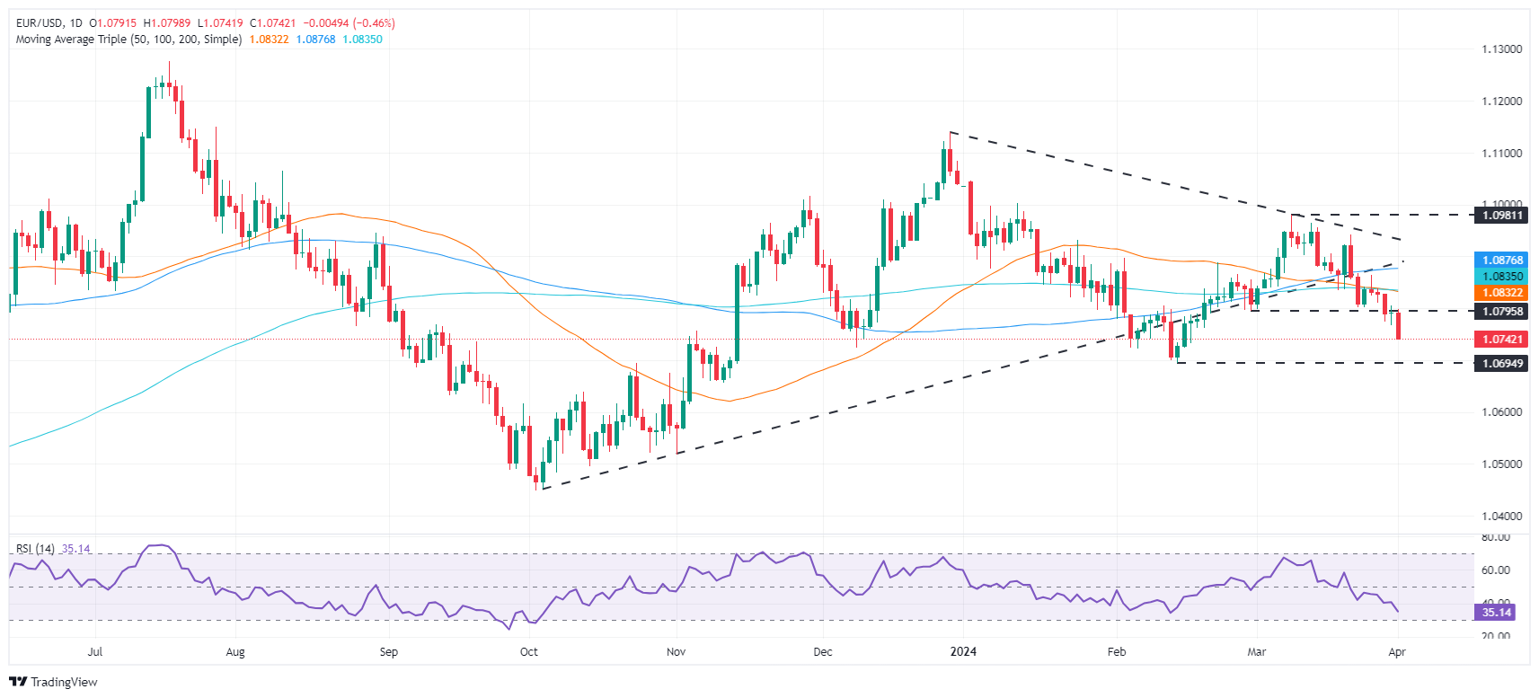 欧元兑美元跌幅扩大,大多数欧洲市场因复活节周一休市。美国数据推动 欧元兑美元下跌,跌幅超过 0.40%,报 1.0742。
