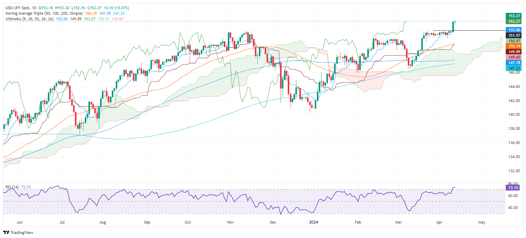 - 美元/日圆受通膨报告和 DXY 上升提振,上探 153.22。