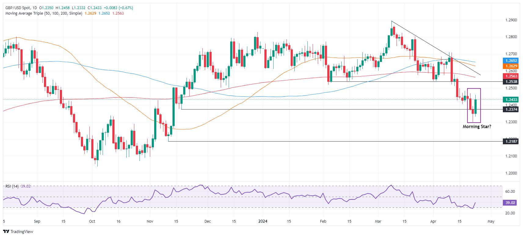 - 技术分析显示,如果英镑/美元维持在 1.2440 附近收盘,完成 "早晨之星 "形态,则有可能上行。