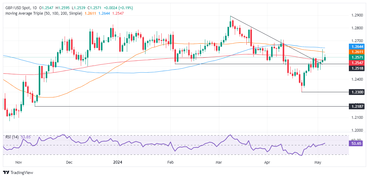 英镑兑美元在突破 200 日移动均缐(DMA)1.2547 后,短期内呈中性至上行走势。从动能角度来看,相对强弱指数(RSI)看涨,这可能会打𫔭挑𢧐 1.2600 大关的大门,略低于 50-DMA 1.2609 的位置。