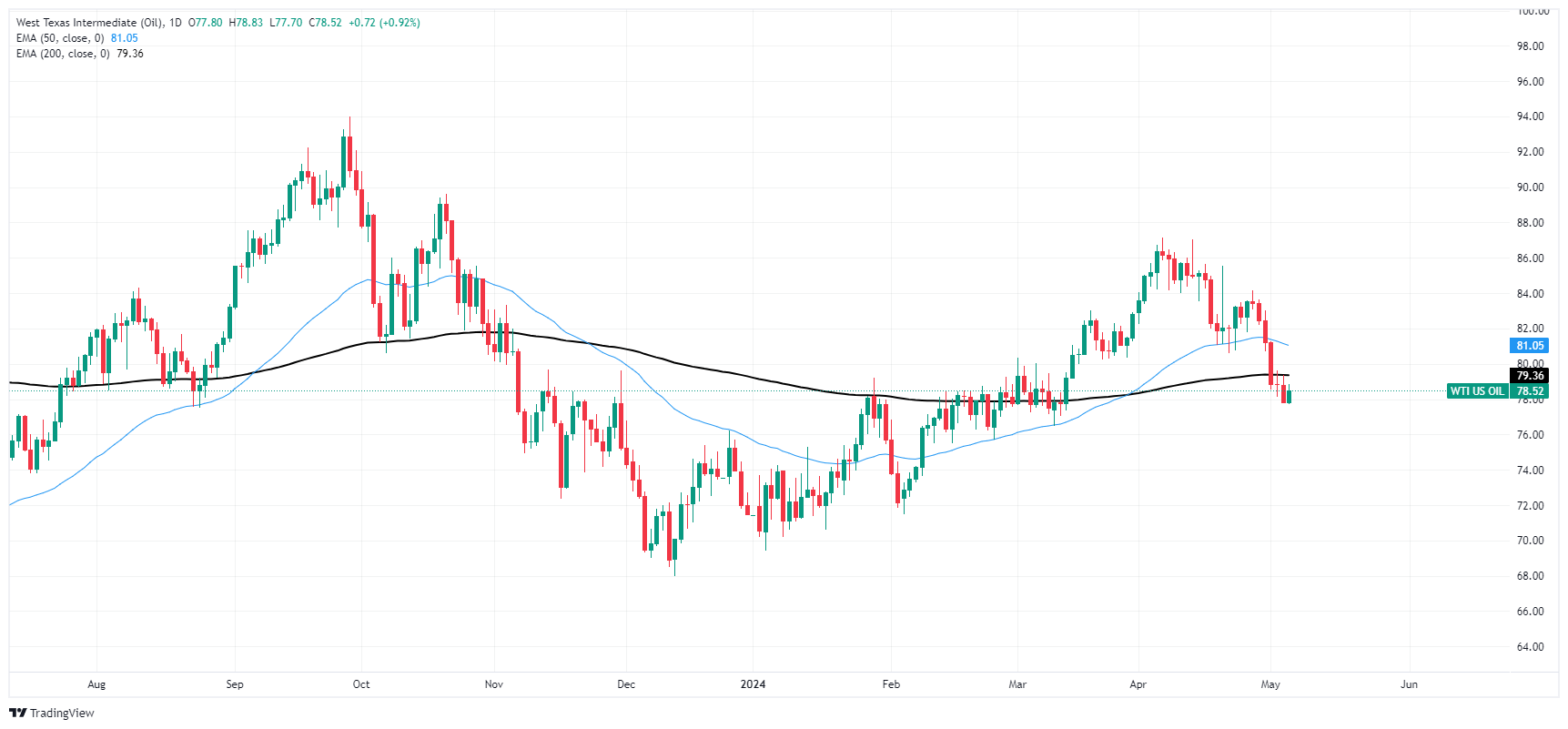近期的原油看跌情绪使WTI油价从 200 小时指数移动均缐(EMA)80.43 美元处进一步下跌,5月美国 原油价格下跌了 3%。