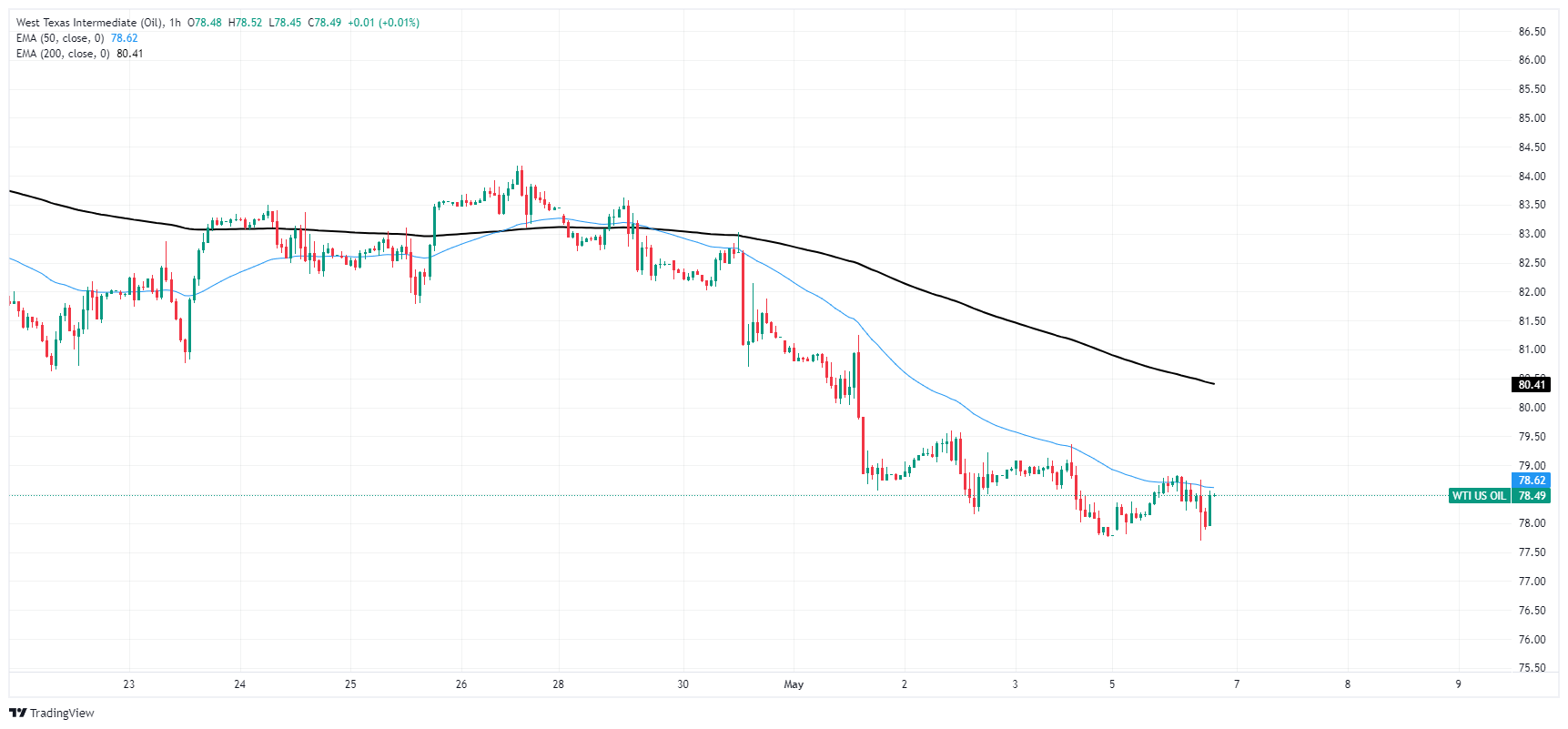 WTI 美国原油在 78.50 美元附近出现波动,市场正在努力争取达成潜在的停火协议,WTI油价桶装原油𧹒盘正寻求在 78.00 美元附近逢低介入。
